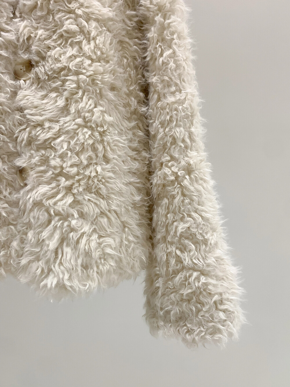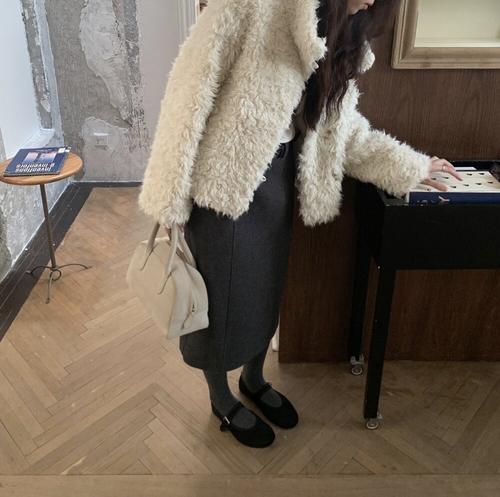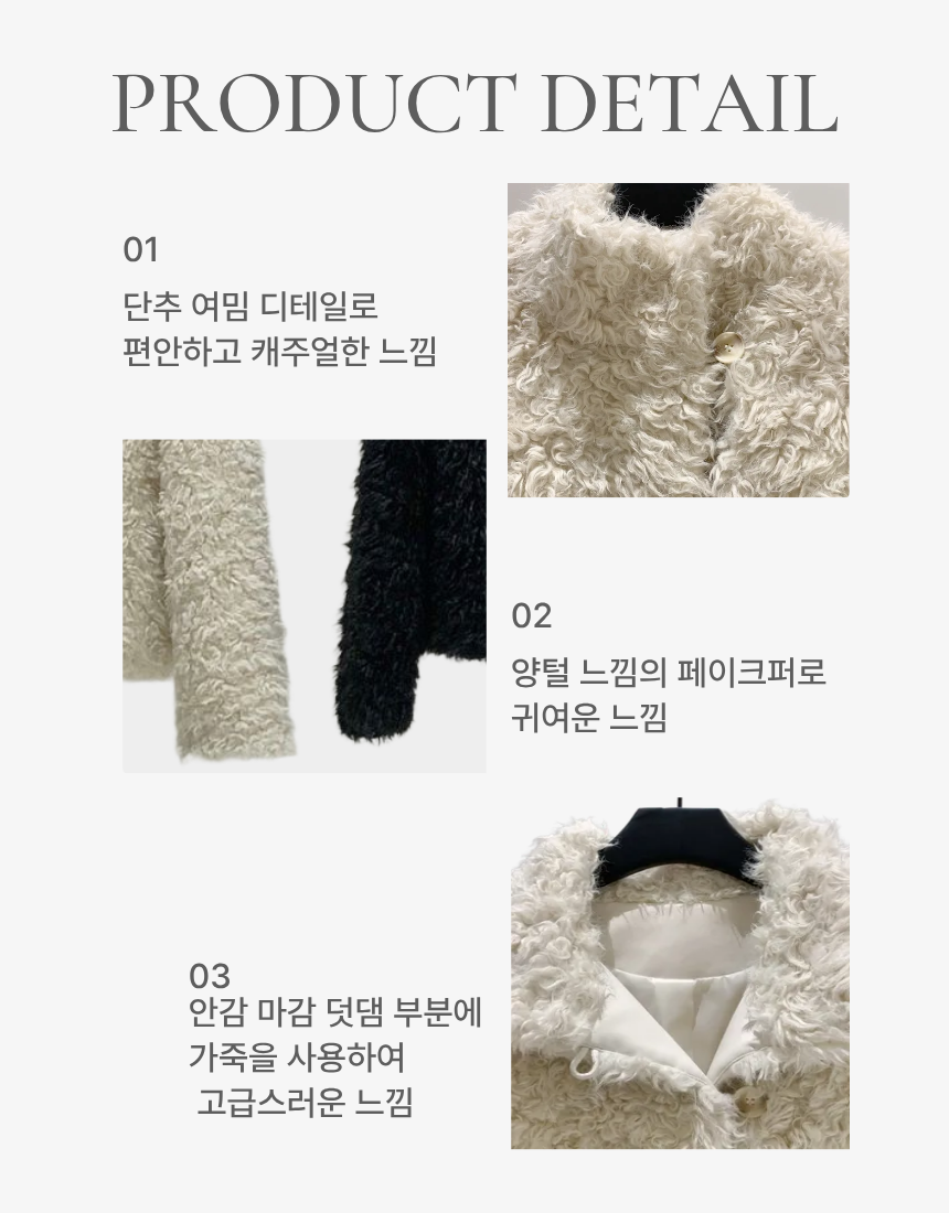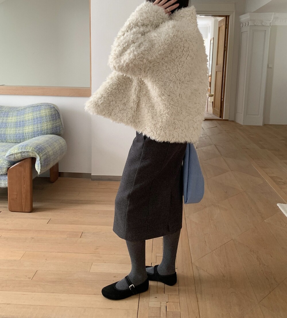 양털을 닮은 입체적인 컬 텍스처의 페이크 퍼 소재를 사용해