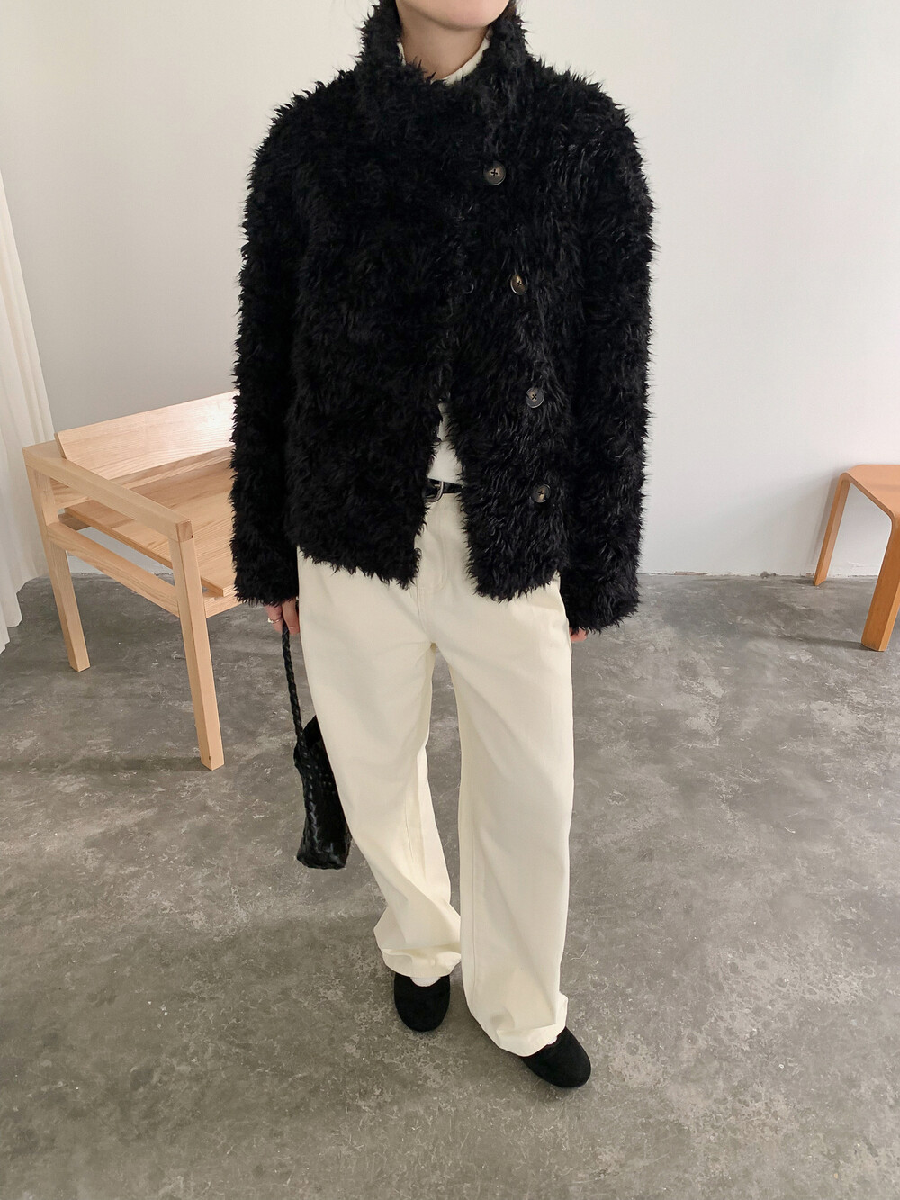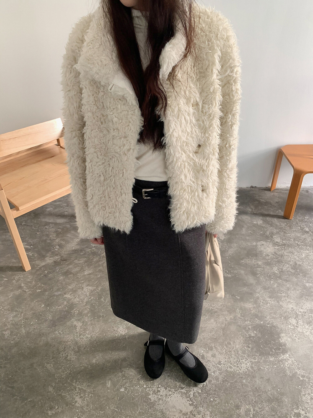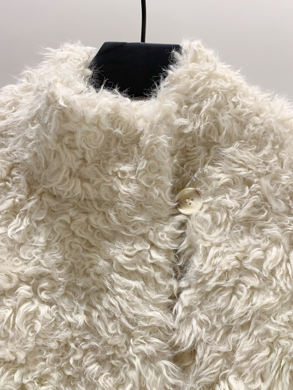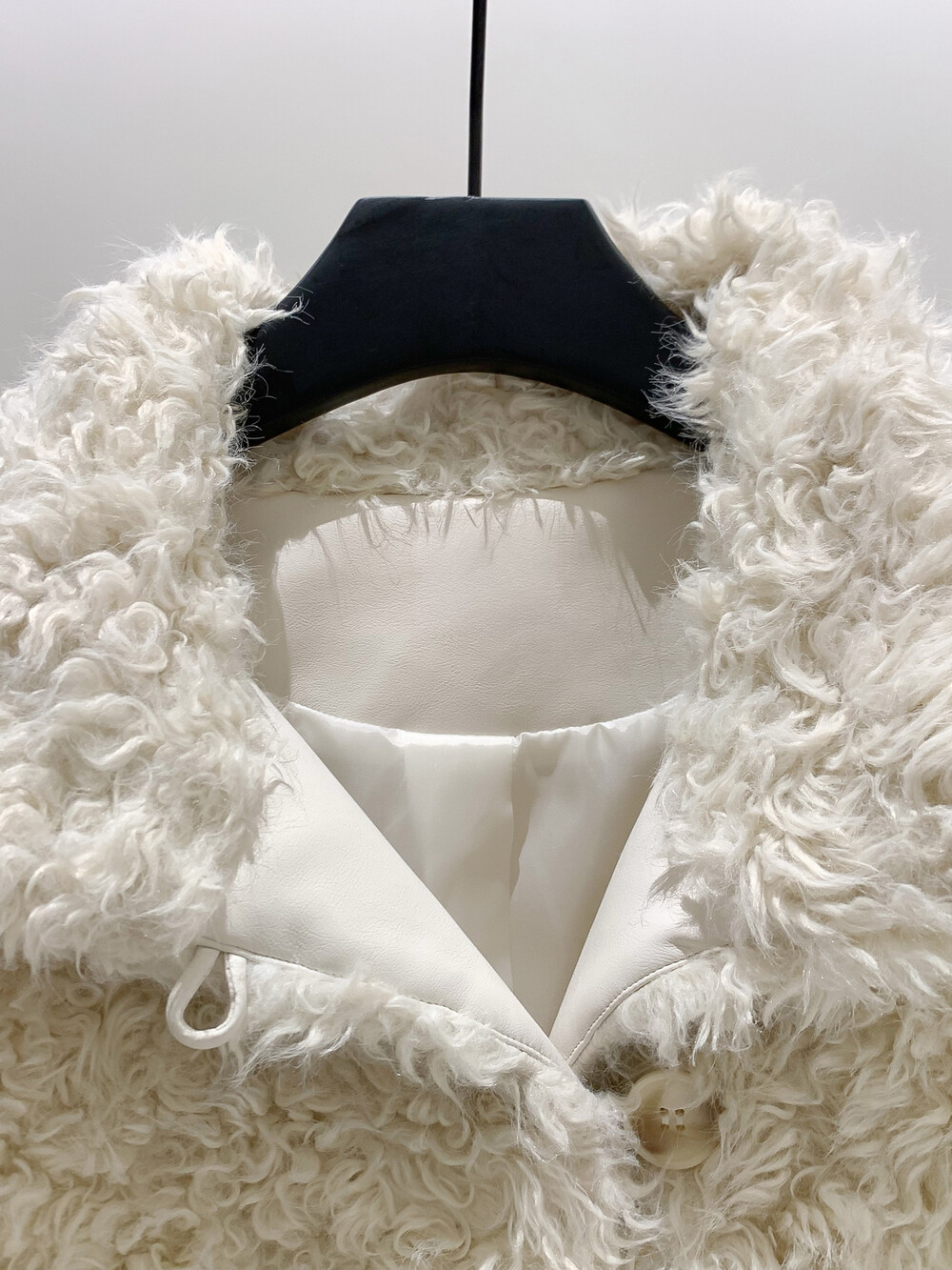 양털을 닮은 입체적인 컬 텍스처의 페이크 퍼 소재를 사용해