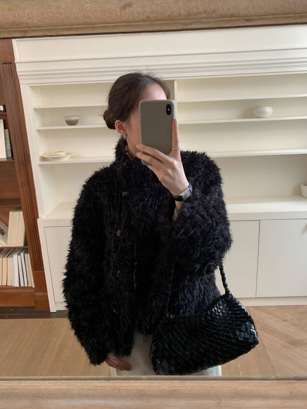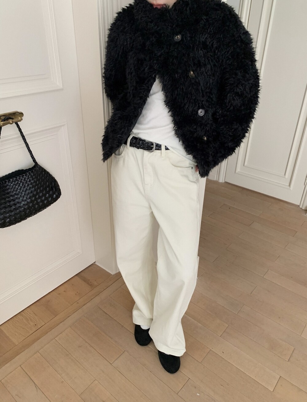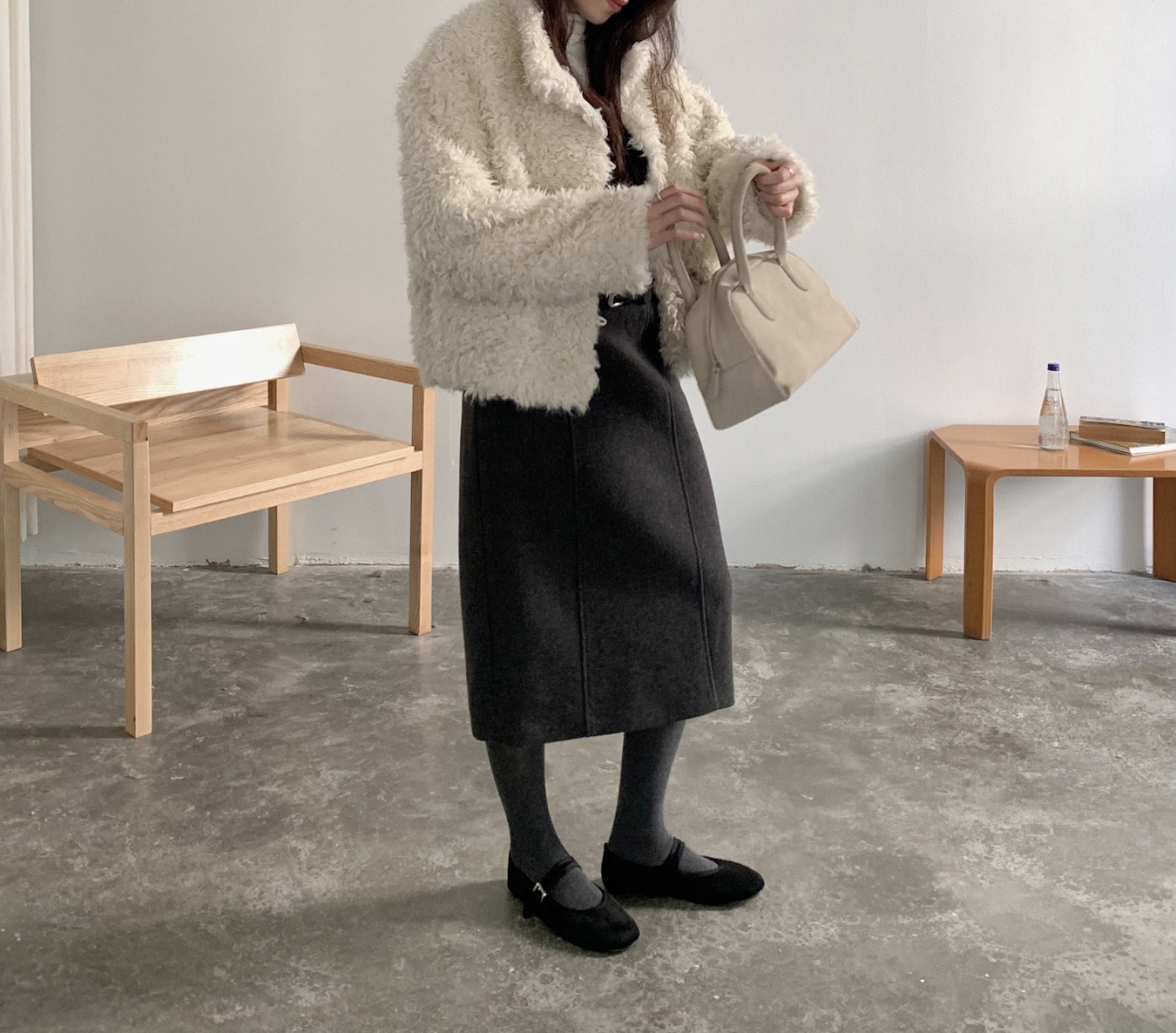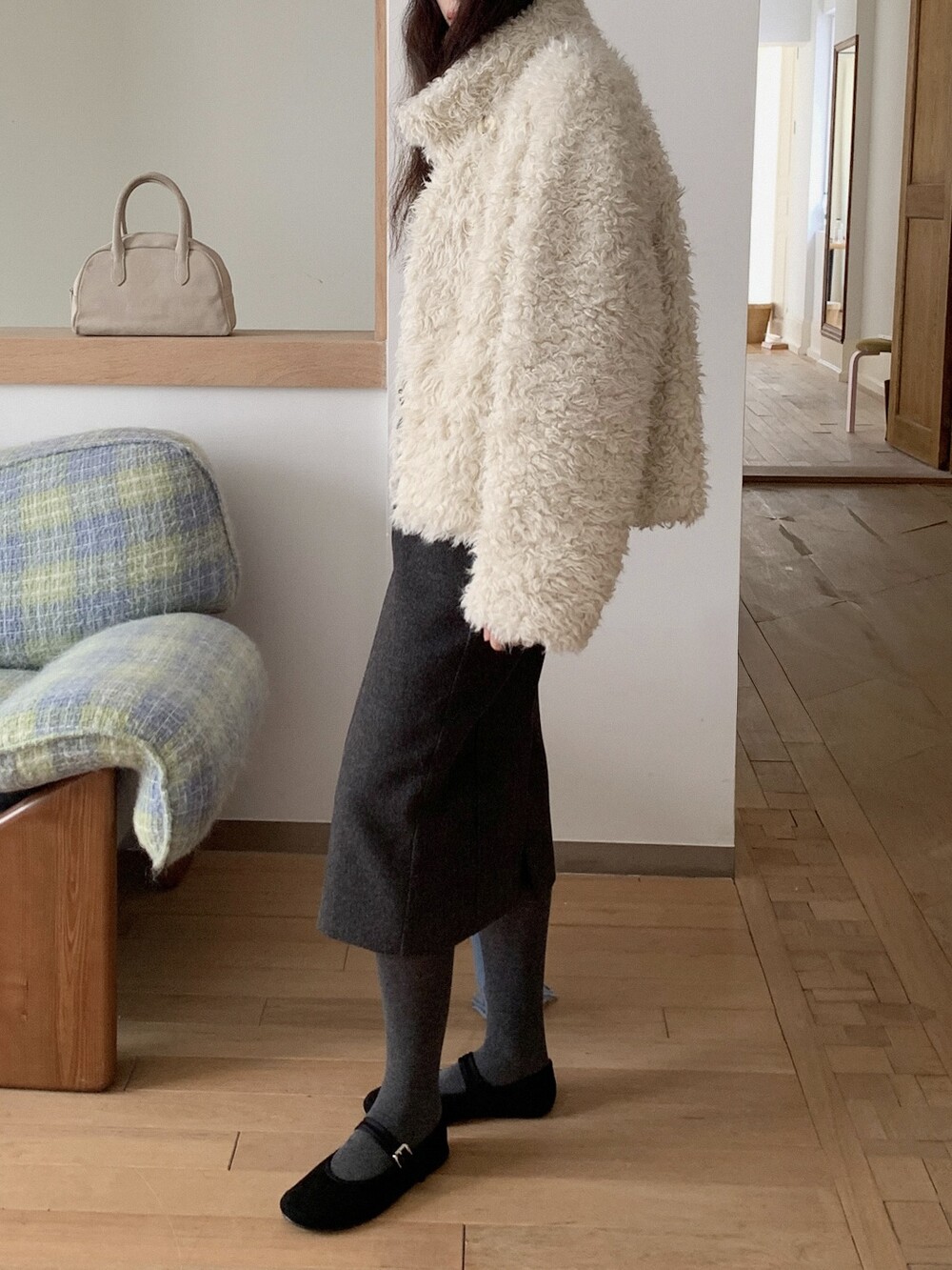 양털을 닮은 입체적인 컬 텍스처의 페이크 퍼 소재를 사용해